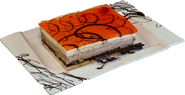 BAJECZNE - Jasny biszkopt przełożony masą czekoladową z chrupkami i masą kakaową oraz pomarańczową galaretką.