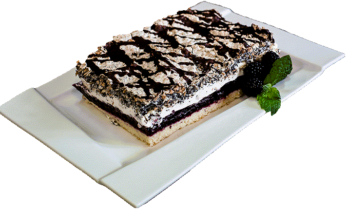 BISKUPIE - Jasny biszkopt z nadzieniem o smaku owoców leśnych, kremem śmietankowym i bezą z makiem.