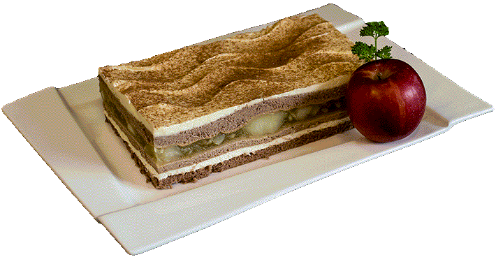 CYNAMONOWY KAPRYS - Biszkopt cynamonowy przełożony jabłkiem i kremem śmietankowym.
