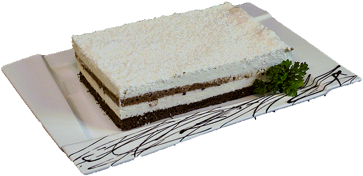 MALIBU - Ciemny biszkopt i ciasto karmelowe przełożone masą kokosową, posypane wiórkami kokosowymi.