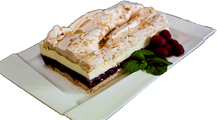 MALINOWA CHMURKA - Ciasto na kruchym spodzie z masą mascarpone i nadzieniem malinowym przykryte bezą.