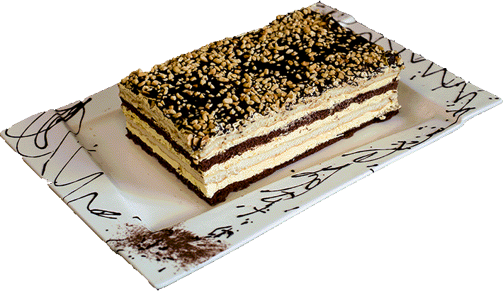 SIERŻANT - Jasny i ciemny biszkopt przełożony kremem ajerkoniakowym oblany czekoladą i obsypany orzechami.
