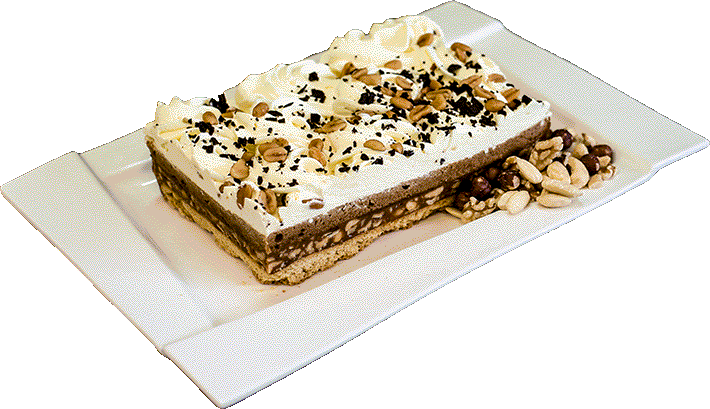 SNICKERS - Ciasto karmelowe przełożone toffi z orzechami przykryte kremem śmietankowym.