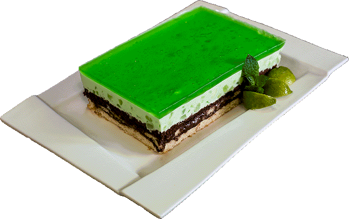 ZIELONE JABŁUSZKO - Jasny i ciemny biszkopt przełożony masą czekoladową z kawałkami herbatników i orzechów, warstwą masy śmietankowej z kawałkami jabłek.